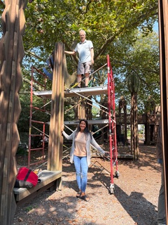 Principal Scioli and Larry McEwen before the capitals come down. McEwen designed and led the community team to build them 27 years ago and is back now to restore them. Volunteers are needed to build and paint.